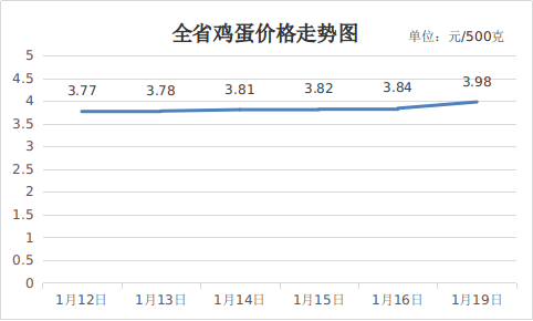 二、鸡蛋价格小幅上涨。部分食品加工企业、电商平台、终端销售商等开始启动春节备货,鸡蛋采购量增加,加之气温较低利于储运,养殖端惜售情绪增强,多重因素支撑下,鸡蛋价格有所上涨。1月19日,鸡蛋平均价格3.98元,周环比上涨5.57%,同比下降20.08%。