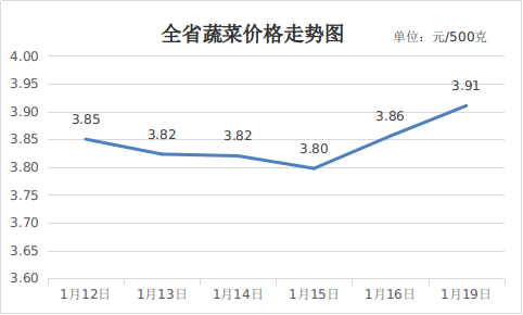 三、蔬菜价格小幅上涨。受近期低温寒潮天气影响,蔬菜生产、储运成本增加,蔬菜价格季节性上涨。1月19日,重点监测的16种蔬菜平均价格为3.91元,周环比上涨1.72%,同比上涨13.86%。
