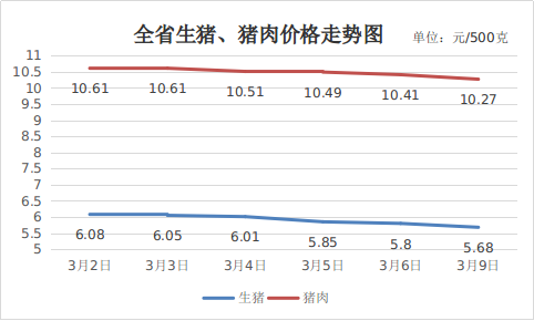 一、猪肉价格小幅下降。供应端:为消化节前压栏库存,生猪出栏节奏加快,供应较为宽松;需求端:猪肉消费仍处于春节、元宵节后的传统淡季,虽然本周因学生返校、工厂复工带来的集团采购有所增加,但对市场价格支撑有限,猪肉价格小幅下降。3月9日,生猪(每500克,下同)平均价格5.68元,周环比下降6.58%,同比下降23.35 %;猪肉(去骨后腿肉)10.27元,周环比下降3.2%,同比下降13.84%;