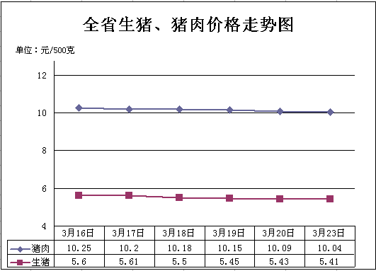 一、猪肉价格小幅下降。供应端养殖企业看空情绪较浓,压栏意愿偏弱,生猪出栏较多,冻肉库存充足。需求端随着气温回升、饮食偏清淡,餐饮和家庭采购不多,加上禽肉、鸡蛋等替代品价格较低分流了一部分消费,市场消化不了过剩供应,猪肉价格随之小幅下降。3月23日,生猪(每500克,下同)平均价格5.41元,周环比下降3.39%,同比下降26.39%;猪肉(去骨后腿肉)10.04元,周环比下降2.05%,同比下降15.56%。