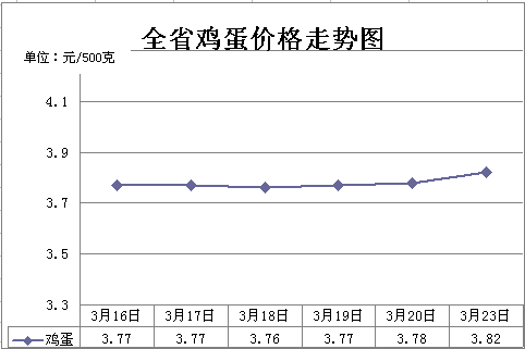 二、鸡蛋价格小幅上涨。近期受饲料价格和油价上涨影响,导致鸡蛋成本有所增加。需求端各类学校和工厂食堂集采较多,带动鸡蛋价格小幅上涨。3月23日,鸡蛋平均价格3.82元,周环比上涨1.33%,同比下降6.83%。