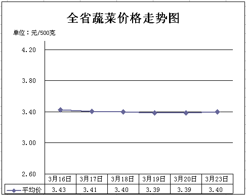 三、蔬菜价格微幅下降。随着气温回暖,本地棚菜进入丰产期,南方大地春菜集中上市,供应充足。需求端,近期肉类和鸡蛋价格偏低,对蔬菜的销售有一定影响,导致蔬菜价格小幅下跌。3月23日,重点监测的16种蔬菜平均价格为3.4元,周环比下降0.73%,同比上涨10.23%。