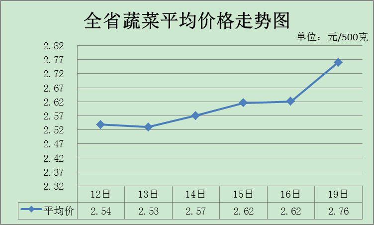 5、蔬菜价格上涨。本周我省持续高温以及部分地区出现降雨天气,对蔬菜的生产流通环节造成影响,特别是对叶菜影响较大。蔬菜价格不同程度上涨,涨幅较大的是油菜、菠菜、黄瓜,比上周一分别上涨31.49%、31.34%、28.51%。监测的16种蔬菜价格12升4降,本周一平均价格2.76元,比上周一上涨8.89%,同比上涨14.44%。